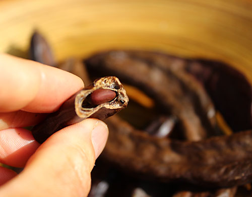 The carob seeds are very hard and not edible, but can be used to plant a carob tree in your backyard or garden space.